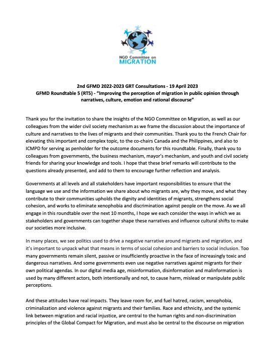 Remarks by Cecilie Kern, Chair of the NGO COM, at the GFMD Consultations on Improving Migration Narratives